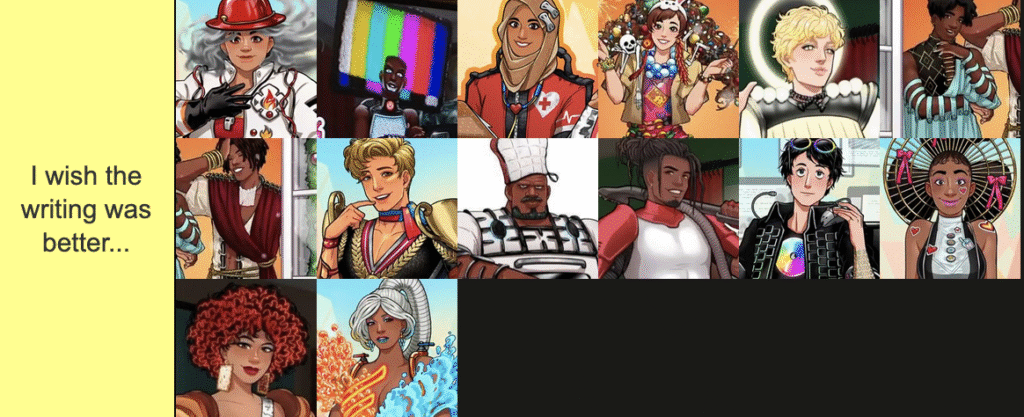 “But Hivver doesn’t that lend to replayability” and like sure… i mean, if you want to replay a game with 100 date-able characters whose stories dont REALLY change as you go through them… it just gets really old really fast.