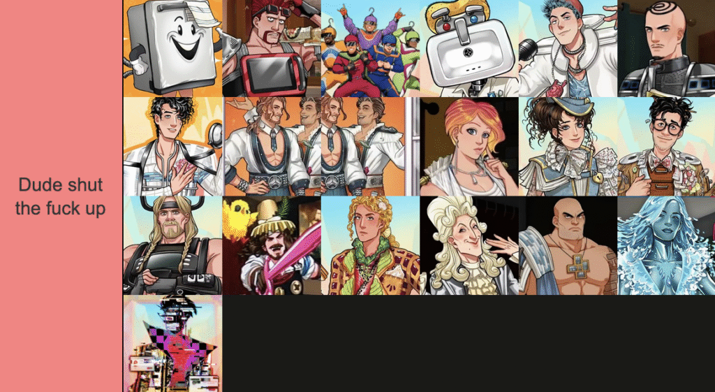- DANTE— I feel like a spiteful part of me is putting him here because I KNOW people are putting him up higher on his voice acting alone. He’s fun but he & Dasha are pretty much the same premise.